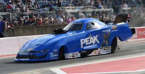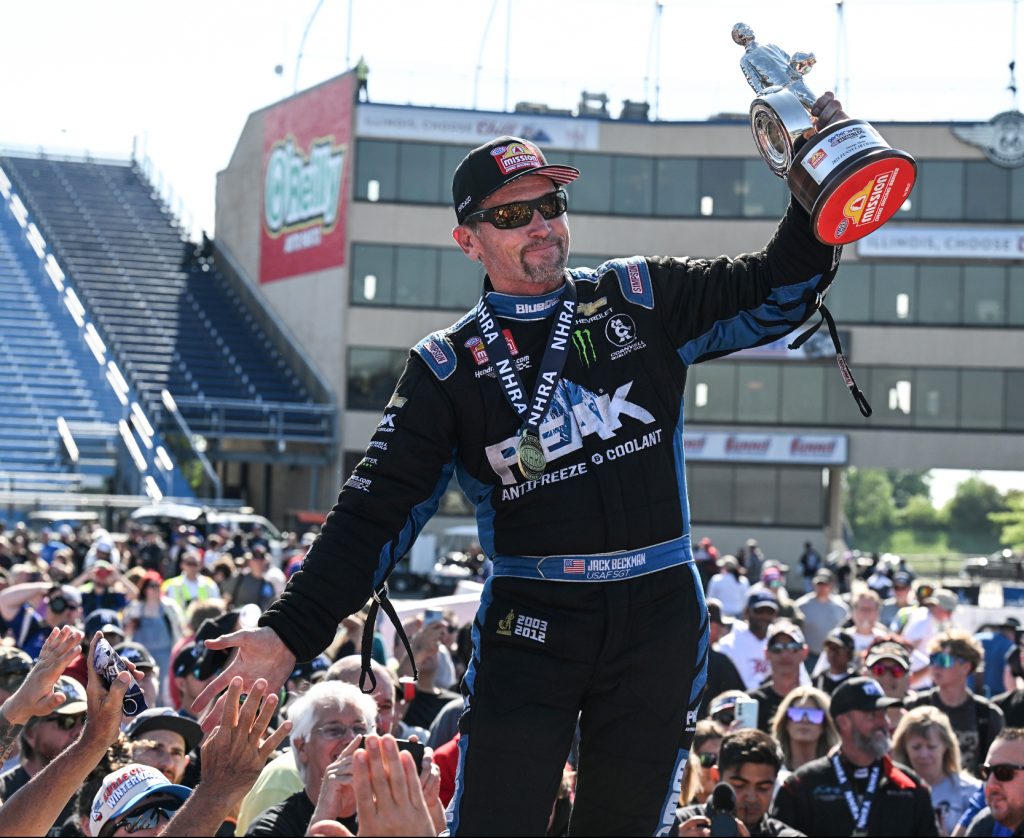 Another First for “Fast Jack” May 21, 2025 // NHRA Event FC Results // editorAt NHRA’s Gerber Glass Route 66 Nationals — Funny Car’s Jack Beckman needed his own impressive performance on the starting line for his final round confrontation. An he delivered that exactly, winning on a holeshot in the final round against John Force Racing teammate and reigning world champion Austin Prock with a run of 3.935 at 325.77 in his PEAK Chevrolet SS. Prock went a quicker 3.933 at 329.02 and had his own solid reaction time, but Beckman went .049, which made the difference at the finish line as he earned his second victory this season and 37th in his professional career. Since returning to racing and taking over driving duties for the legendary John Force late last year, Beckman has four wins in 14 races, moving to second in points on Sunday with the memorable victory at his sponsor’s race. The veteran and former world champion got past Dave Richards, Chad Green and Cruz Pedregon to set up the all-JFR final round. It ensured a fourth JFR win in the first six races of 2025, as both Beckman and Prock continue to roll at an impressive pace. On Sunday, though, it was Beckman who got back on track in a major way after first-round losses at the previous two events. “Every win is great and I have a lot of trophies from places like Indy and my home track in Pomona but winning here in Chicago, a track that was off the tour for a while is as good as it gets,” said Beckman, who was making his first appearance in Chicago since 2019. “It’s also the headquarters for PEAK and we’ve got 623 employees here.