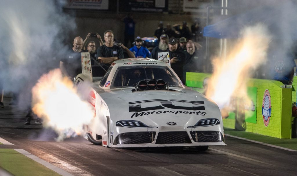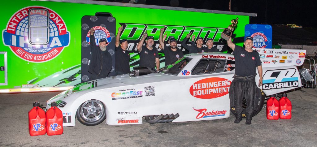 Points Leader Prevails California’s Del Worsham won the Funny Car division for the IHRA Outlaw Nitro Series event held at Darana Dragway — West Salem, Ohio. Del earned both the $50,000 winners’ purse and his 2nd prestigious IHRA Ironman trophy of the season. with the races live-streamed on IHRA.TV and SPEED SPORT 1. Del became the first repeat winner this season for the Funny Car class when he beat Terry Haddock in the final round – using a hole shot start with an effort of 3.823 secs at 269.95 mph — within the 1/8th mile format event. Haddock had a slightly better time and speed at 3.282 seconds and 271.25 mph. Worsham, who had qualified #1 had dispatched Joe Morrison in the semifinals and Jacob Slater in the quarterfinals. He has been to all four final rounds this season, matching his own mark of four straight final rounds in 1992. “What a day. We’ve closed the deal in two of them now,” Worsham said. “We’ve been to all the finals, and I’ve had tough competition. Every time, the car next to me goes to the finish line, and always makes a full run. That makes it tough because it makes no room for error. A lot of hard work went into this one.” Worsham had the quick run of 3.320 seconds at 265.02 mph to position himself at the top of the Funny Car leader going into Saturday’s eliminations. Terry Haddock was next quick at 3.391 seconds and 241.29 mph. Dale Creasy, Joe Morrison and Jody Austin rounded out the top five – for the presented 8-car field. The IHRA’s Outlaw Nitro Series for 2025 has one race left for it’s season calendar – coming up at Galot Motorports Park in NC (Nov. 5-8). Posted with files by IHRA Communicaitons & Bruce Biegler