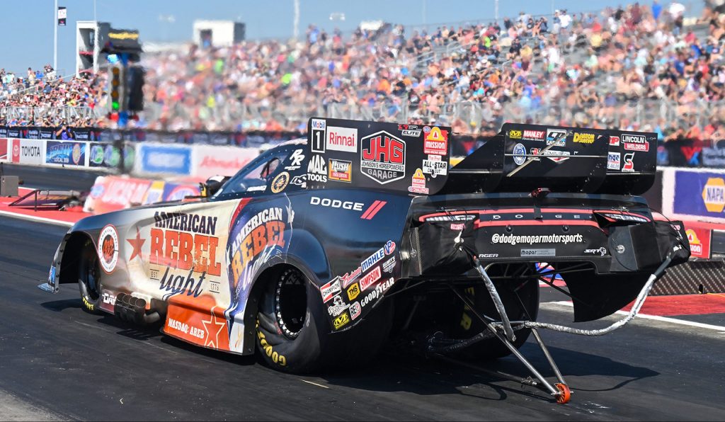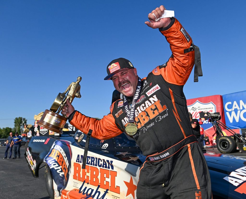 Into Contention Again! Oct 01, 2025 // NHRA Event FC Results // editorMatt Hagan, the four-time NHRA World Champion, continued his trek to a fifth Funny Car championship by driving the Tony Stewart Racing (TSR) Dodge//SRT Hellcat to his 54th career NHRA national event victory at the NHRA Midwest Nationals. After placing runner-up the previous weekend at Charlotte, Hagan and his American Rebel Light Beer Dodge//SRT Hellcat looked strong immediately with a spectacular 3.868 qualifying pass on Friday to take the second position in the 16-driver field at World Wide Technology Raceway in St. Louis, which enjoyed several sold-out crowds during the three-day NHRA national event. The Virginia driver then ripped off 3.90s in each of the four rounds of eliminations to score his second 2025 NHRA victory after taking top honors at the Seattle event. The victory moved Hagan within 20 points of leader Austin Prock with three races remaining in the 20-event national tour. A fifth world title for Hagan would vault him into NHRA drag racing lore by passing legends Don Prudhomme and Kenny Bernstein, who each collected four NHRA Funny Car crowns during their careers. Only John Force, with 16 championships, has more than Hagan, Prudhomme and Bernstein in the Funny Car division. In the final round, Hagan’s nitro-burning machine recorded a 3.979 to Jack Beckman’s 4.032 after Hagan took out Alex Laughlin with a 3.964 pass, Cruz Pedregon with a 3.988 and Daniel Wilkerson with a 3.990 in earlier rounds. “I was looking forward to shaving the mustache, but it looks like we have to keep it now with the win,” said Hagan. “We knew coming into this race that we were all chasing Austin (Prock). He’s won eight races this year, but no one is infallible. We had to be ready if they messed up. Mike Knudsen (crew chief), Phil Shuler (co-crew chief), Alex Conaway (car chief) and all of my guys worked so hard all day. The right lane was bumpy, and they navigated those bumps really well. I felt good about the racecar.” “My lights came around and that gave me confidence going into the next couple rounds. That’s the stuff that makes you a strong team. It is great to have outstanding sponsors like American Rebel Light, Dodge//SRT, Direct Connection and Johnson’s Horsepowered Garage. I wake up some days and pinch myself that this is my job. We’re back in this hunt for the championship.”  As he most often does – Bob Tasca III was the fastest FC overall — this time at a booming 337.33 mph NHRA Napa MidWest Nationals – Funny Car Class Summary WIN: Matt Hagan – 3.979 secs 329.32 mph (Career win #54) R/UP: Jack Beckman – 4.032 secs 314.83 mph Low ET: Austin Prock – 3.845 secs Top MPH: Bob Tasca III – 337.33 mph Bump: 4.531 Entries – 16 cars  Chad Green had another formidable event placing – going to the “final four” on Sunday for the 2nd straight NHRA nationals event. Posted with files by Tom Blattler & Bruce Biegler