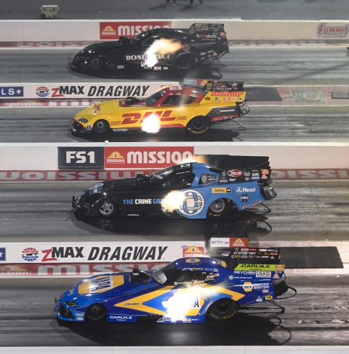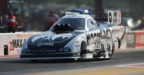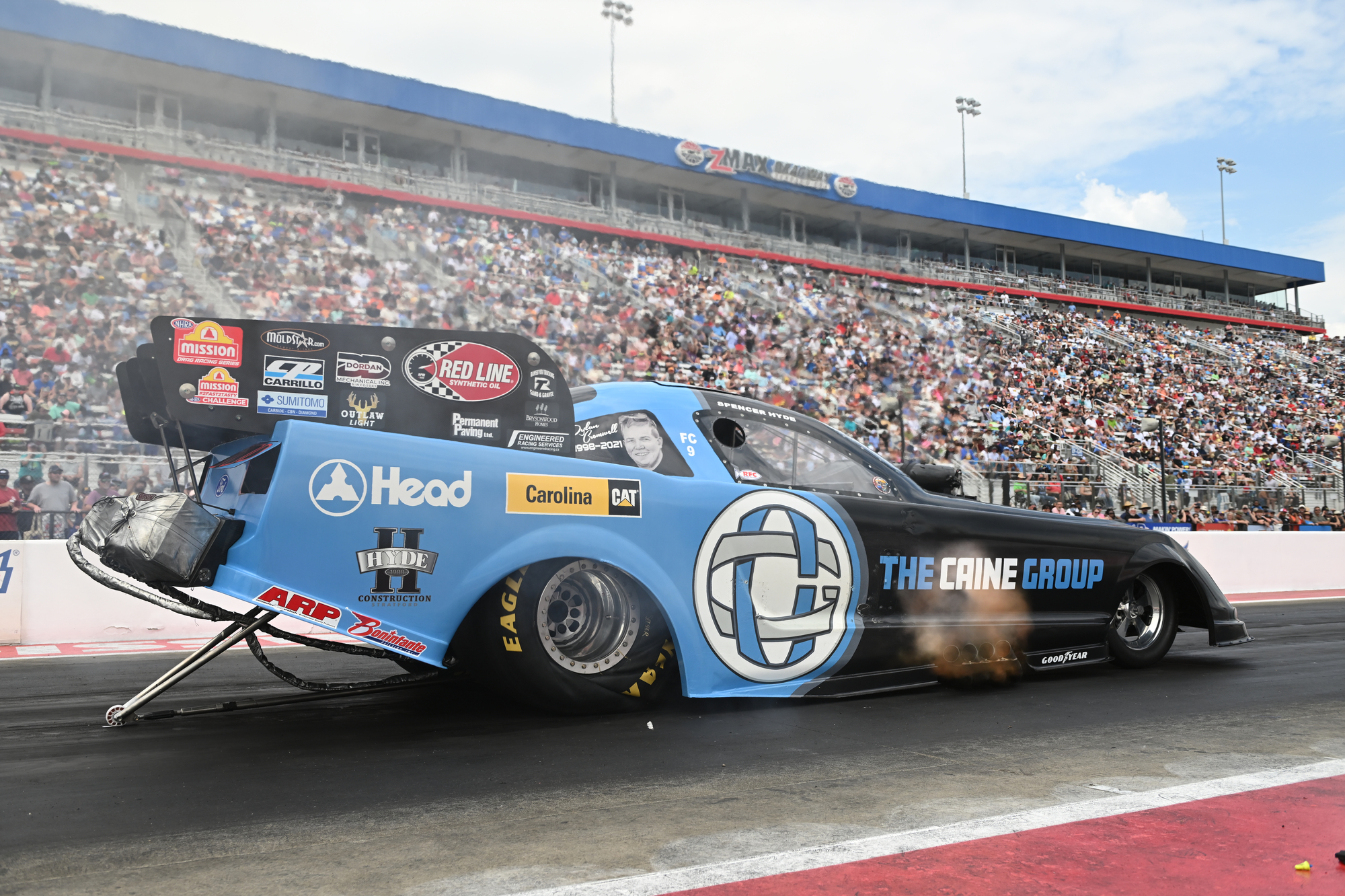 Two Canadian native drivers were in the FC mix at zMax. Jeff Arend appears to have helped immediately turn the fortunes for the Jim Dunn Racing Team – with a solid 4.080 secs qualifier. Ontario’s Spencer Hyde ran this special edition “The Caine Group” Mustang for Jim Head Racing to the #9 qualified slot (3.981 secs). Posted with files by Allison McCormick (ABM Communications) & Bruce Biegler