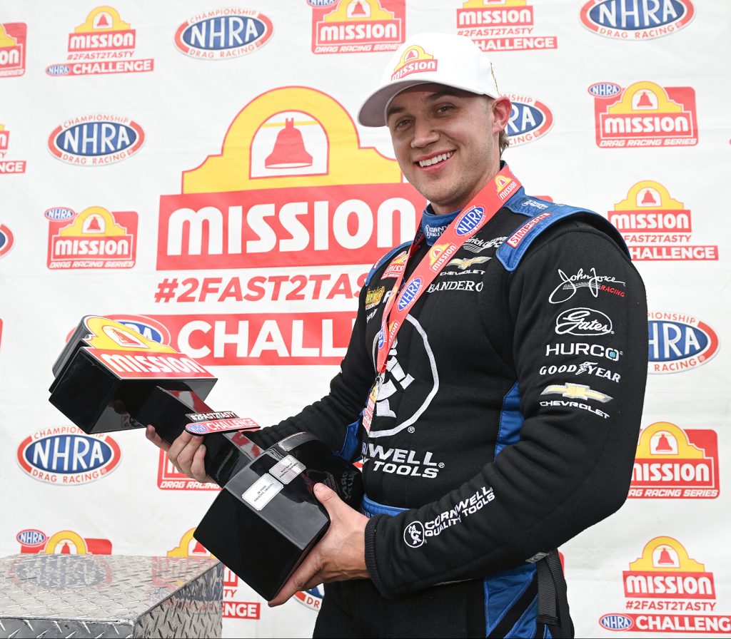 Jordan Vandergriff – new team driver for John Force Racing – collected his first ever drag racing trophy — winning the Mission #2Fast2Tasty Challenger (on Saturday) NHRA 4-Wide Nationals – Funny Car Class Summary